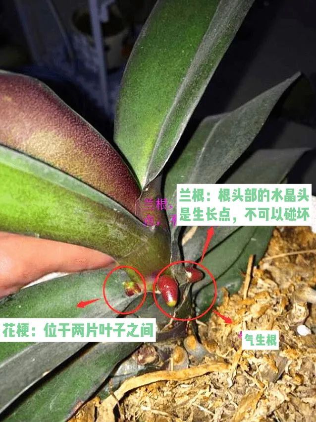 ②叶鞘。蝴蝶兰的茎尖和叶鞘处不可积水。