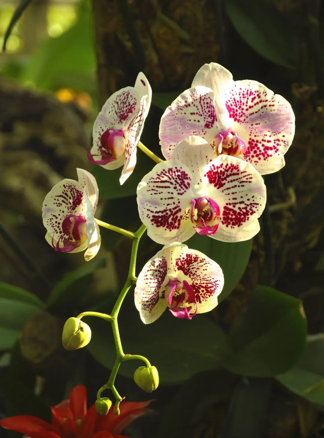有的花友发现在蝴蝶兰最下面的茎部各串出一个“小枝条”,在询问这是否为花梗?对,就是花梗!通过适当增加施肥频率(但施肥浓度要更稀,控制在2000-3000倍)和提高温度后,花会开的更快一些。