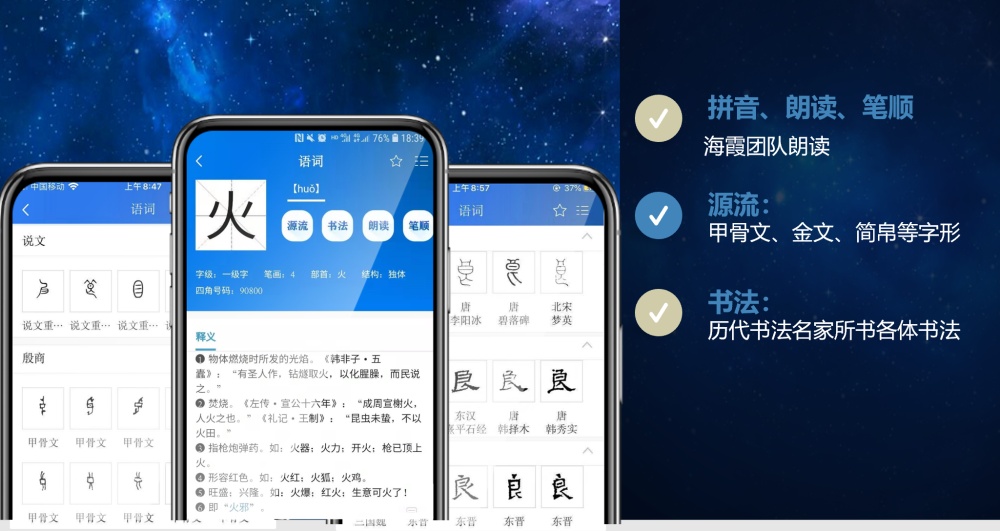 语词方面,为所有词目增加了拼音标注和人声朗读,由著名主持人海霞领衔的团队配音,并为8105个通用规范字提供了规范书写动态笔顺;新增“汉字源流”,为7000余个汉字收录约3万个甲骨文、金文、简帛等古文字字形,展示汉字的早期形态和演变轨迹;新增语词单字“书法”,收录历代2000余位名家的书法16万余幅,满足用户查看同一汉字不同书体、不同风格作品的需要。