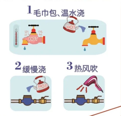 建议先用温毛巾包裹水龙头,然后浇温水,使龙头解冻。拧开龙头,用温水沿水龙头慢慢向管子浇洒,使水管解冻。用吹风机来回吹水表及周边管道。如果浇至水表处仍不见有水流出,就说明水表也冻住了,此时再用热毛巾包在水表上,用不高于30度的温水浇洒,使水表解冻,切忌用火烘烤。