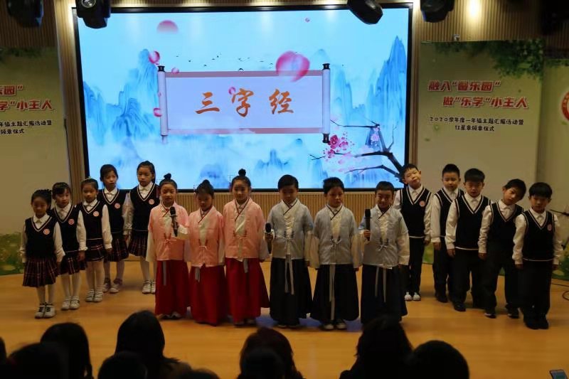 在各学科老师的带领下,各个班级精心准备的学科演绎拉开了帷幕——一(2)班同学带来《拼音识字真有趣》,展示了汉语拼音和识字方法;古诗吟唱很有意蕴,一(5)班学生带领大家走进江南的荷花池,唱出一曲《鱼戏莲叶间》 ;一(4)班学生身着传统汉服,读着朗朗上口的《三字经》,在生动的表演中教会大家为人处世的道理。