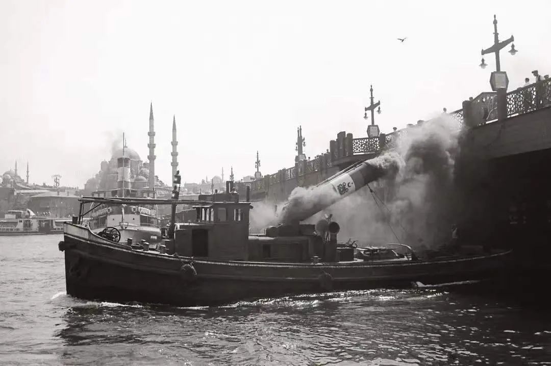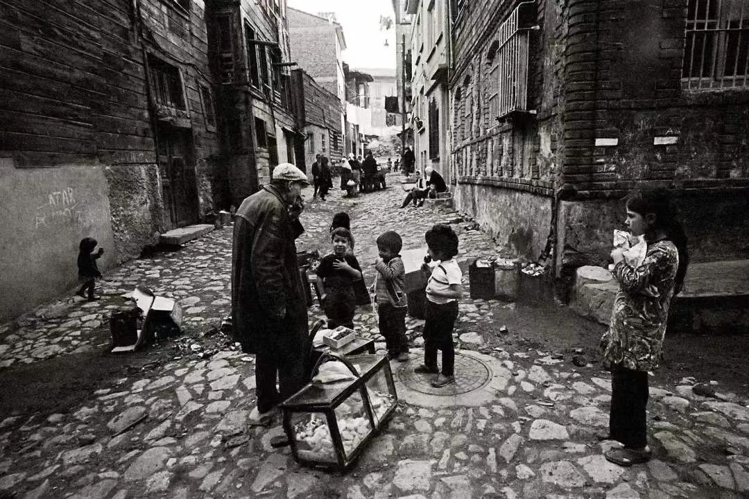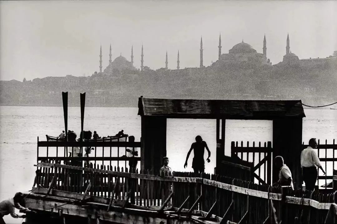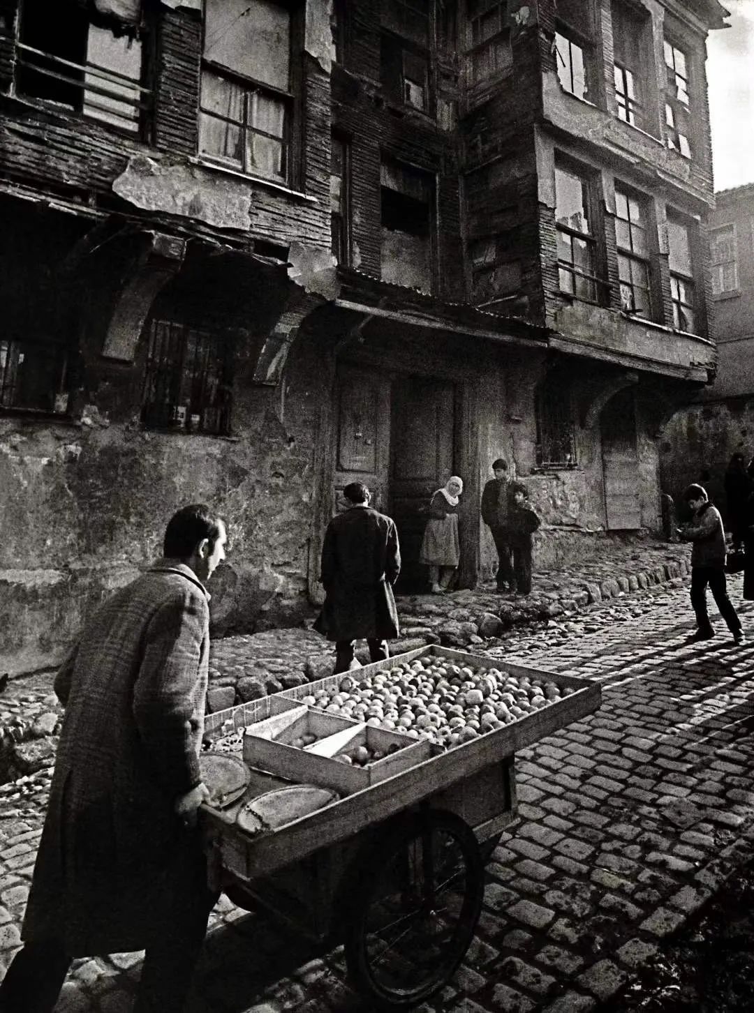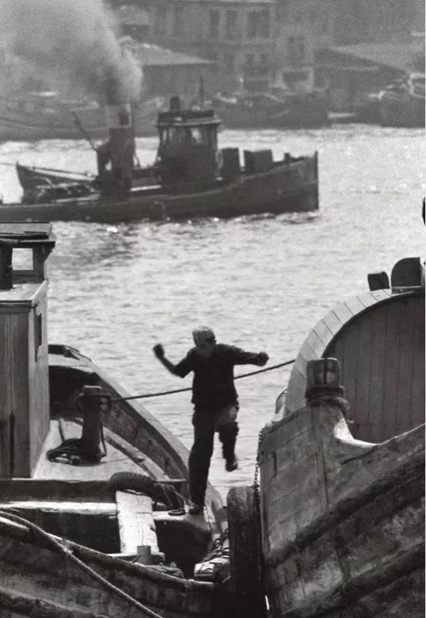 古勒照片展示的是,渔民在咖啡馆修补渔网,失业的男人在酒馆喝酒,孩子们在垮掉的城墙前修补轮胎,捡破烂的人,守门人,建筑工人,皮革商人和修路工,小小年纪就被迫干重活的学徒,水果小贩推着他们的手推车满大街招徕顾客,船夫划船把伊斯坦布尔的人从金角湾的一头运到另一头,上班族一大早就在等加拉塔大桥放行,以及那些开首班公共出租车的人——古勒永远是通过这个城市的人来表达他与这个城市的联系的。