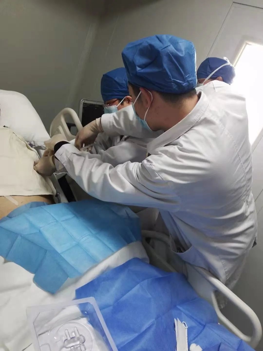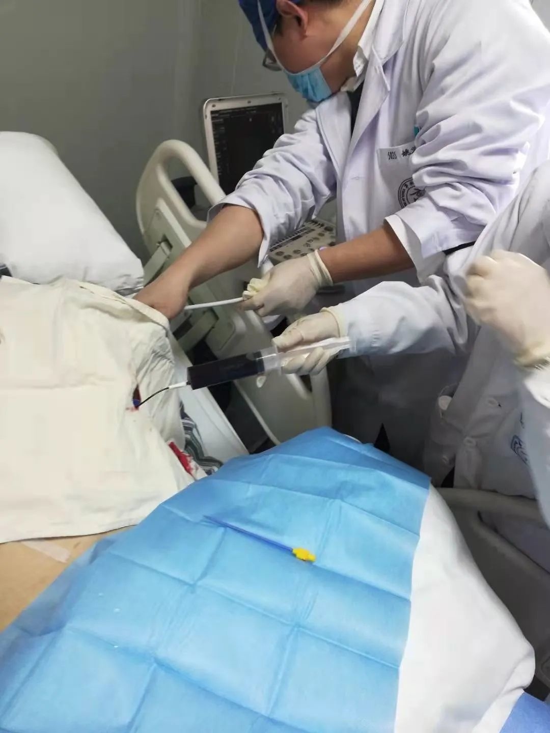 同济医院心内科医生姚义安、亭林医院心内科医生周勤、黎庆伟立即来到ICU,为病人做心包穿刺。麻醉、确定穿刺部位、进针、缓慢抽出180毫升液体,第二次抽取约200毫升液体。