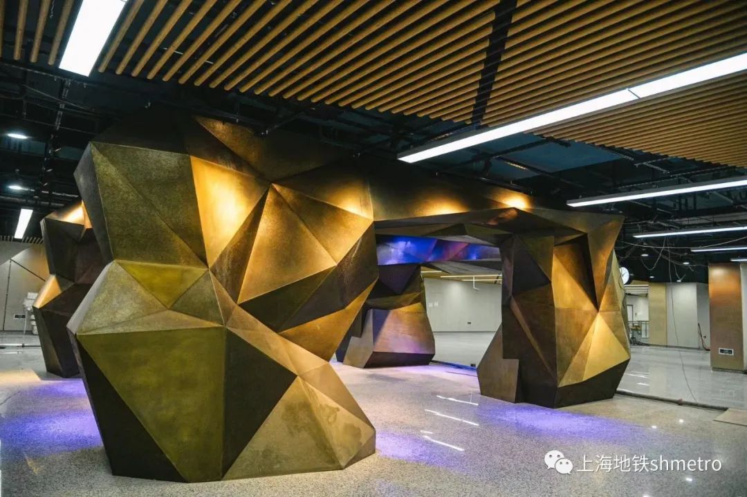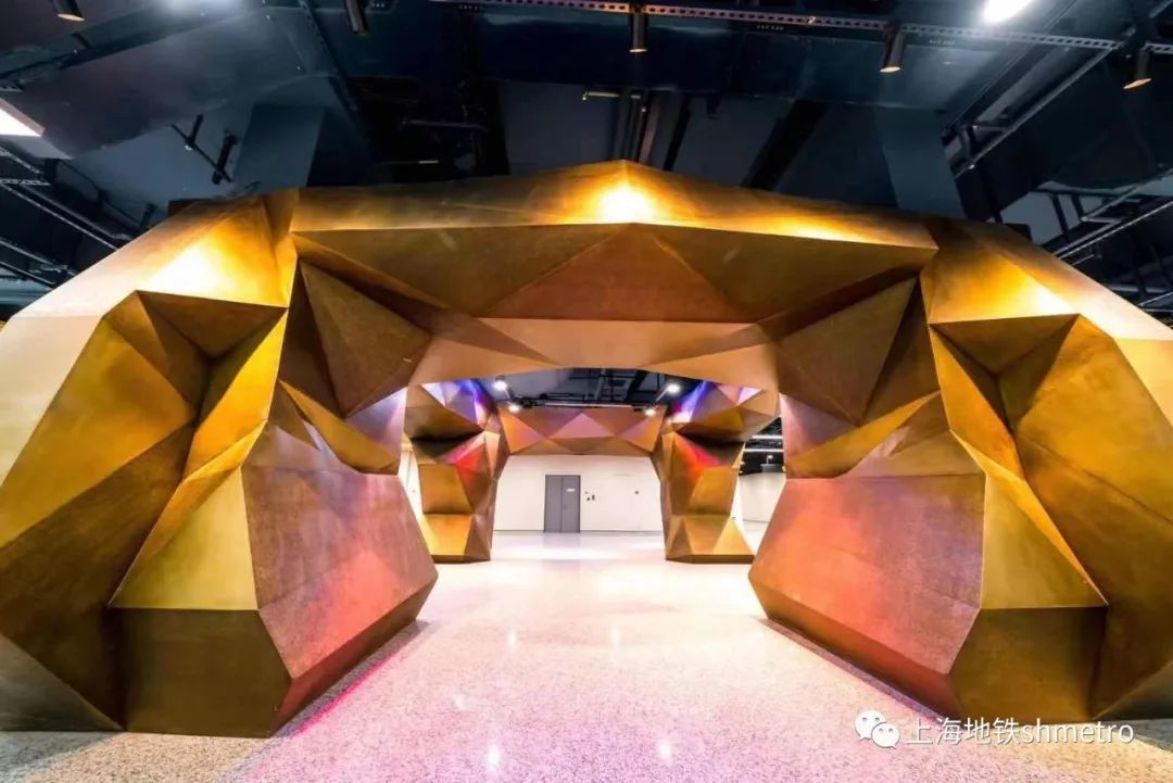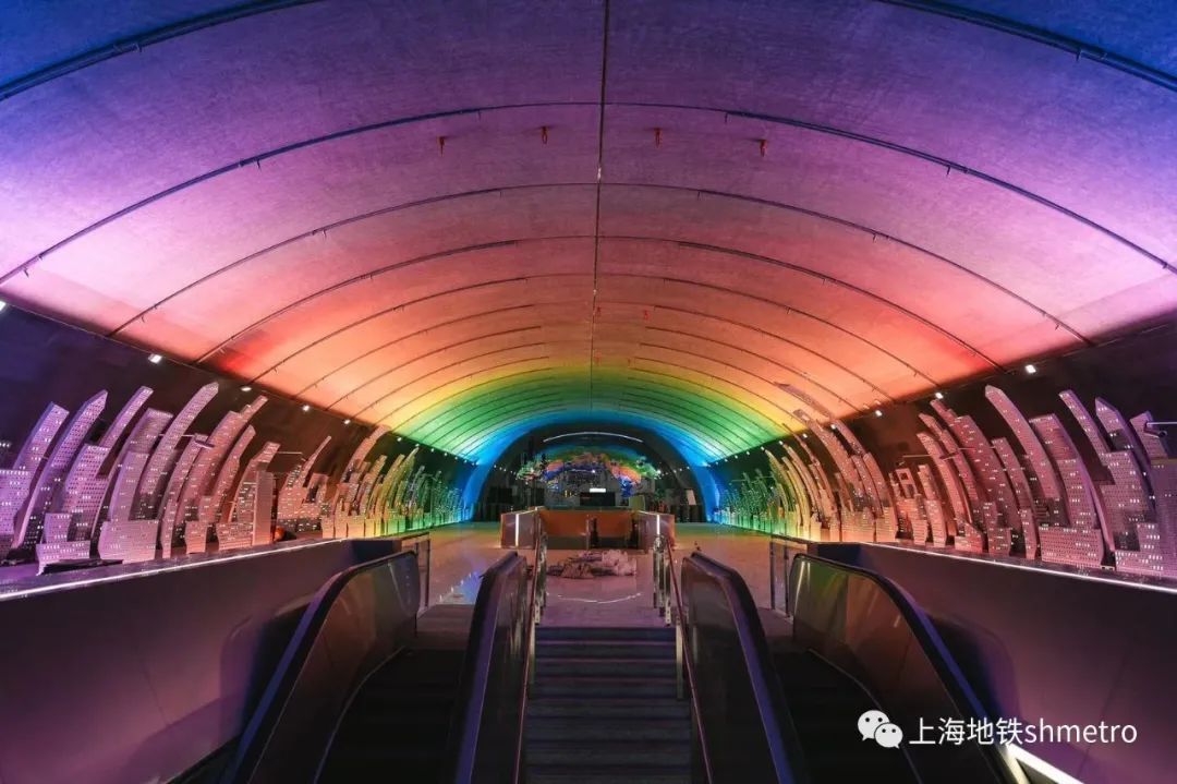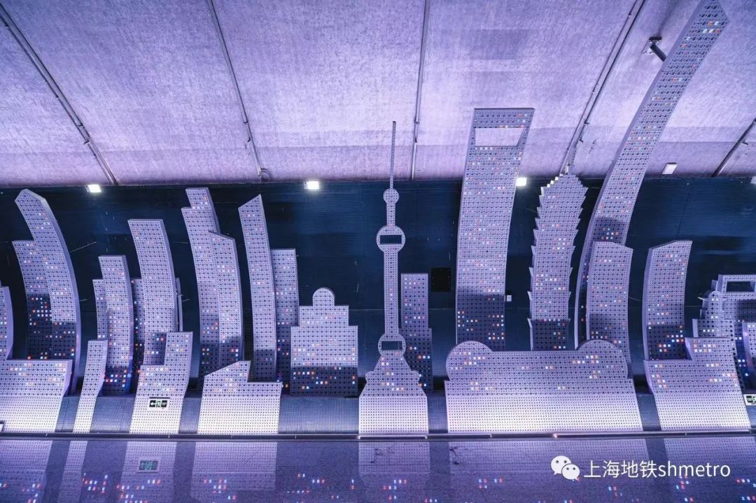 车站装饰首次在地铁中尝试应用多元化场景,包含文化商业活动;信息艺术教育;节日庆典定制不同场景的应用,将车站空间打造成为一幅蕴藏无限可能的城市画板,带来沉浸于宏大叙事中的震撼体验。将上海浦江两岸天际线以76米长画卷呈现于站厅拱廊,以铝板“剪纸”构筑起的都市天际线成为空间主要的装饰元素,层次丰富,尺度合理。