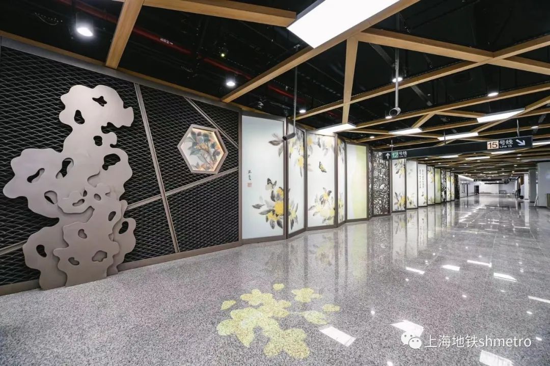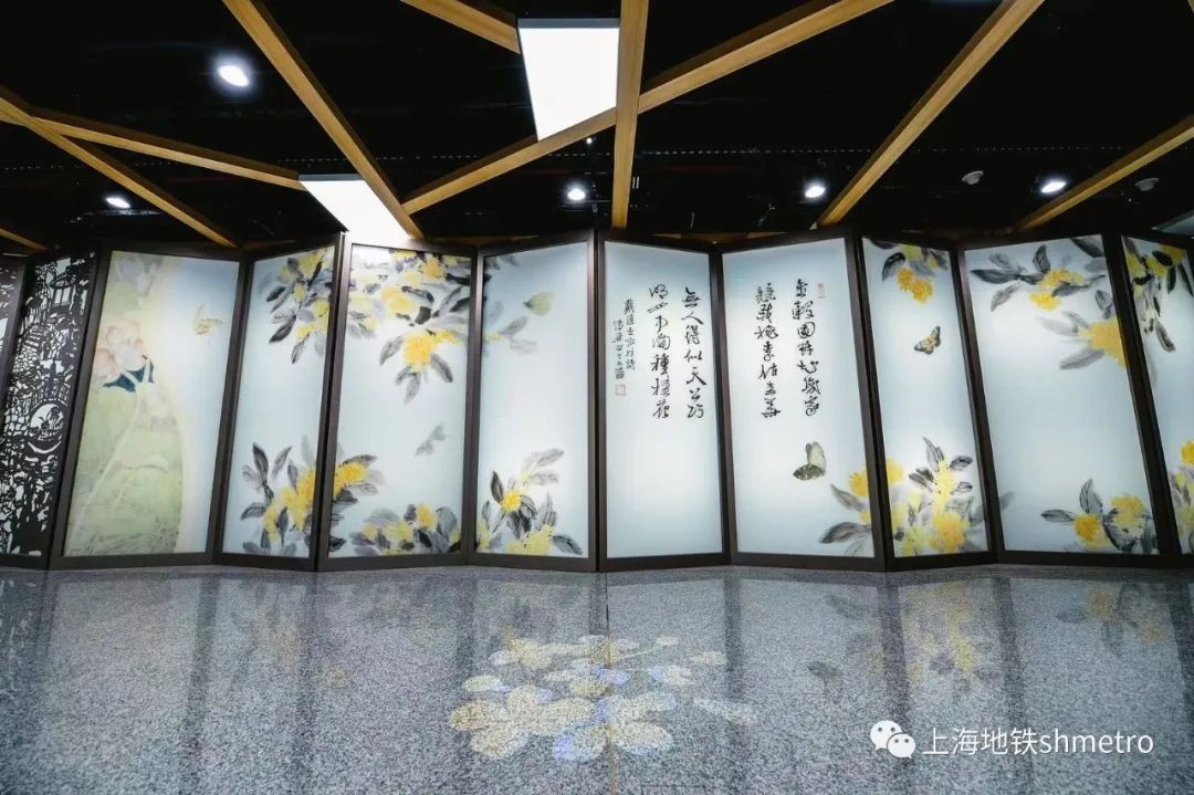 本案以桂林公园为创作题材,主题墙面采用中式屏风造型,主屏由艺术家精心彩绘的桂花、旗袍人物、蝴蝶等穿插,气韵浑然天成,妙趣匠心独具。题画书法为宋代诗人戴复古的咏桂诗:“金谷园林知几家,竞栽桃李作春华。无人得似天工巧,明月中间种桂花”。金属镂雕屏汲取桂林公园小桥流水、叠山立峰、嶙峋怪石的景色,两者结合共同营造出一幅生动的人文自然画面。两侧墙面的瓦片、窗格、太湖石尽显江南园林意境之美,随影随势,不拘一格。站厅柱子横梁运用中式窗格元素,桂花、蝴蝶点缀其中。整体装置简洁大气,给人以大气磅礴的视觉盛宴……