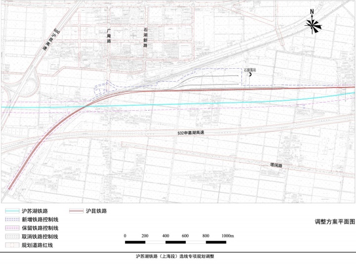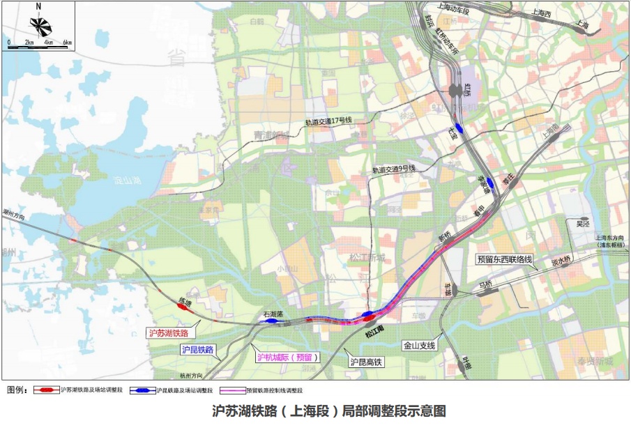 此外,新增石湖荡站为沪昆铁路客货运站,替代现有松江火车站货场功能,设置6条到发线(含正线),同时设综合性货场,位于申嘉湖高速以北、斜塘以西区域。