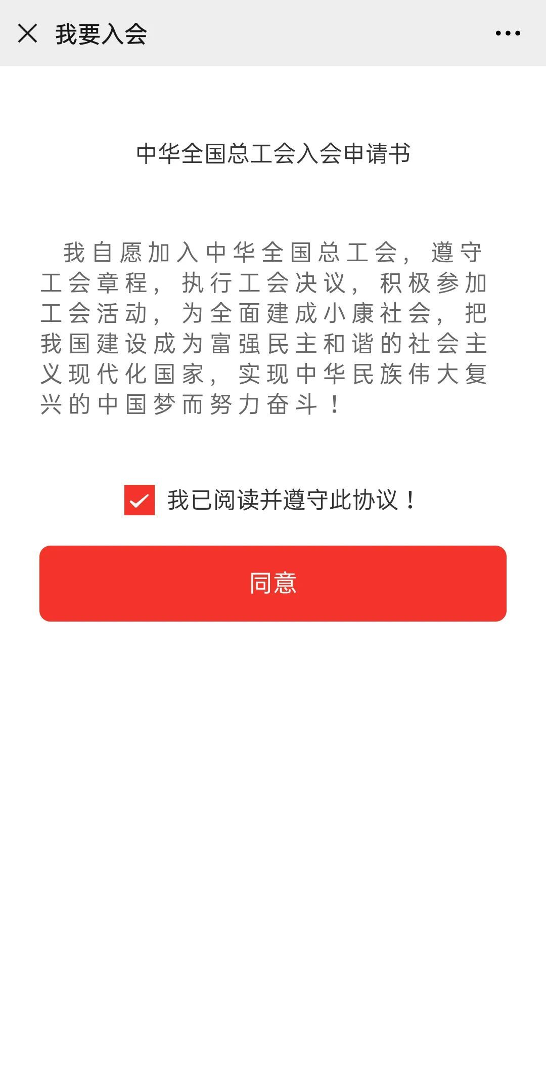 进入【申工社-服务大厅-我要入会】,点击入会申请,待跳出“中华全国总工会入会申请书”页面后,请仔细阅读后点击同意,填写表上相关信息后提交申请即可。