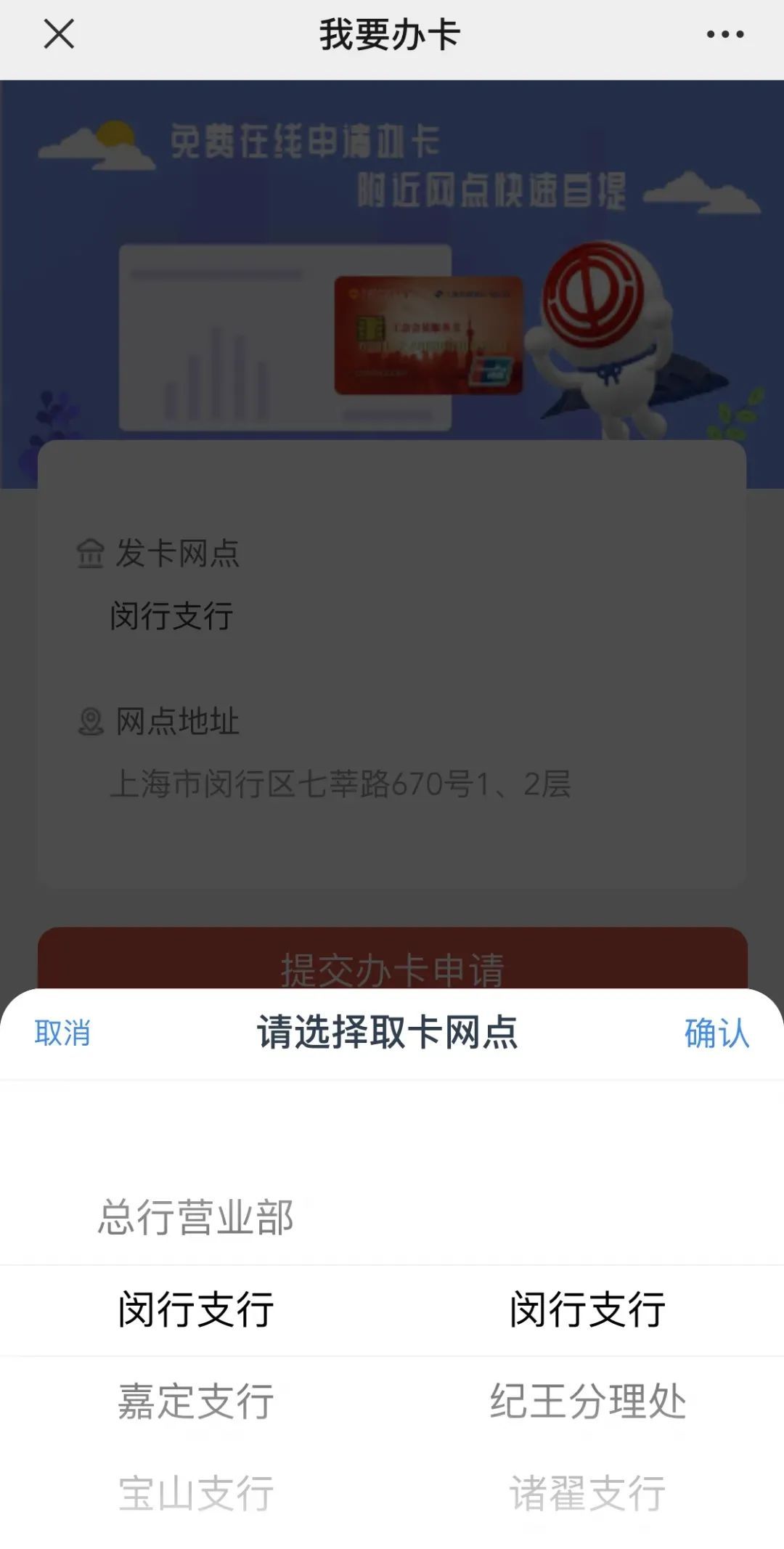 通过会员信息验证后,进行取卡网点选择,页面会自动显示所选网点的地址,确认信息无误后点击【提交办卡申请】。