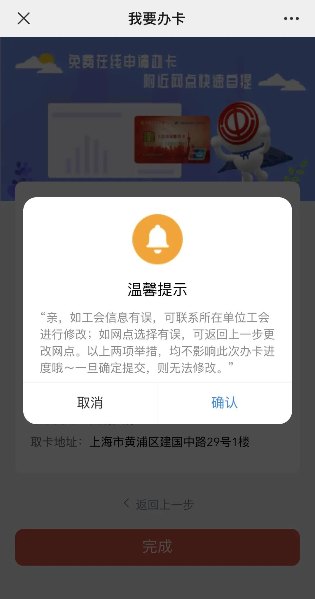 工会会员务必核对个人的申请办卡信息,确认信息无误后点击【完成】。