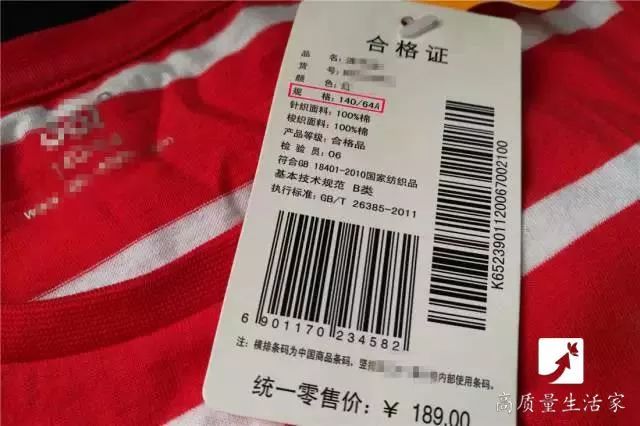 标牌上没有标明身高和胸围的型号,这种衣服是不合格的。“140/64A”便是合格服装的型号标注。
