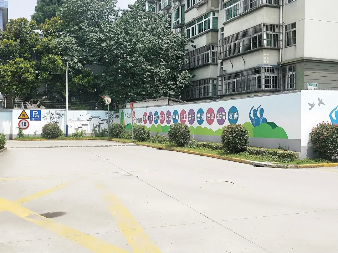 一墙一文化,一墙一特色,一墙一风景。朱泾镇对人民路两侧破旧围墙重新粉刷美化,并开辟“社会主义核心价值观”宣传新阵地。同时在东林寺广场及城南市场新增86个彩绘人行分隔设施,一组组生动有趣、图文并茂的彩绘设施内容丰富,在亮化街区的同时,倡导新时代文明新风。