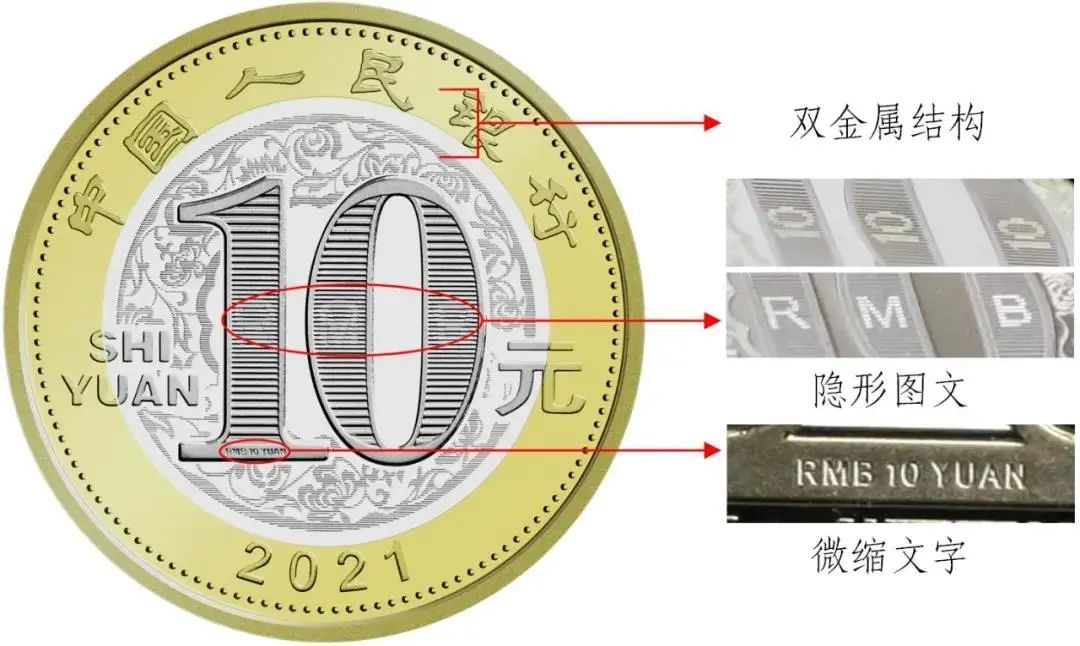 将硬币倾斜适当角度,可在正面面额数字“10”的轮廓线内,观察到两组由3个“10”“RMB”构成的隐形图文。