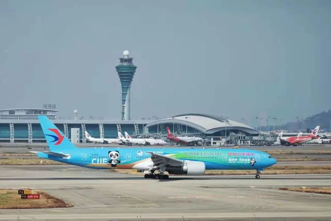 喷绘熊猫“进宝”元素的B777-300ER飞机