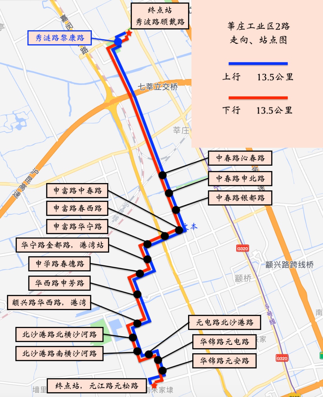 依次停靠华锦路元安路、华锦路元电路、元电路北沙港路、北沙港路南横沙河路、北沙港路北横沙河路、颛兴路华西路、华西路申芳路、申学路春德路、华宁路金都路、申富路华宁路、申富路春西路、申富路中春路、中春路银都路、中春路申北路、中春路沁春路、秀涟路黎康路(上行)。合计下行15个站点,上行16个站点。