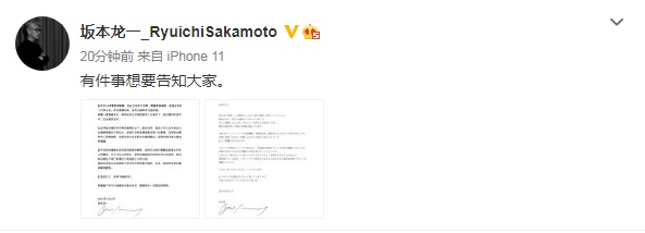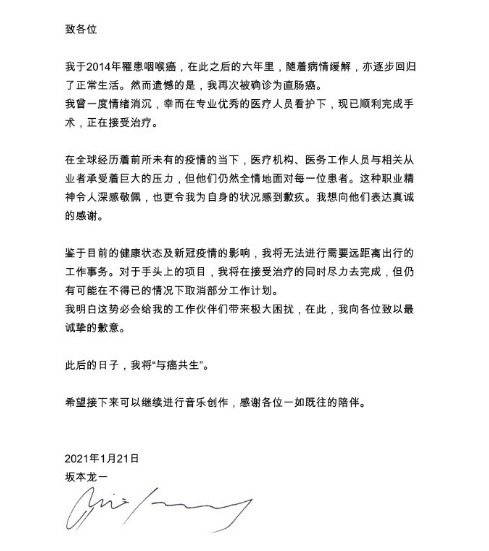 1月21日,日本作曲家、音乐制作人坂本龙一在微博发文,称自己被确诊为直肠癌,目前已经顺利完成手术,正在接受治疗。