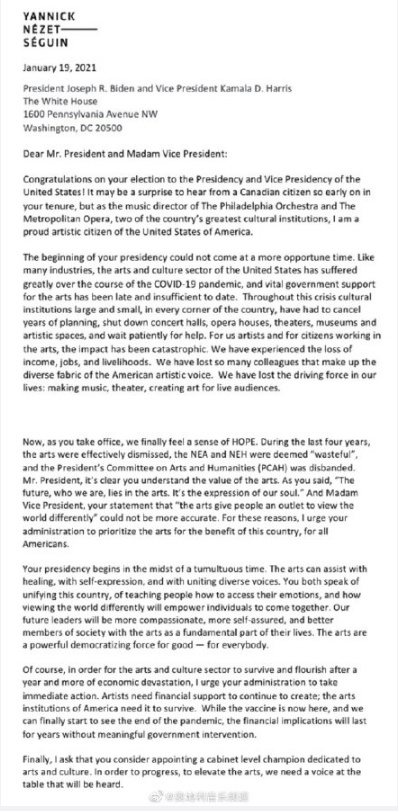 1月19日,身兼费城交响乐团、美国大都会歌剧院两大机构音乐总监的加拿大人雅尼克·涅杰-瑟贡(Yannick Nézet-Séguin)致信美国新任总统拜登、副总统哈里斯,请求他们立即采取行动拯救受疫情打击的美国艺术界。