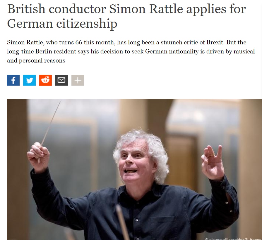 出生于英国的指挥家西蒙·拉特尔(Simon Rattle)宣布加入德国国籍,西蒙·拉特尔长期以来一直是英国退欧的坚定批评者,他表示,仍打算保留英国国籍,决定加入德国国籍是出于音乐和个人原因。