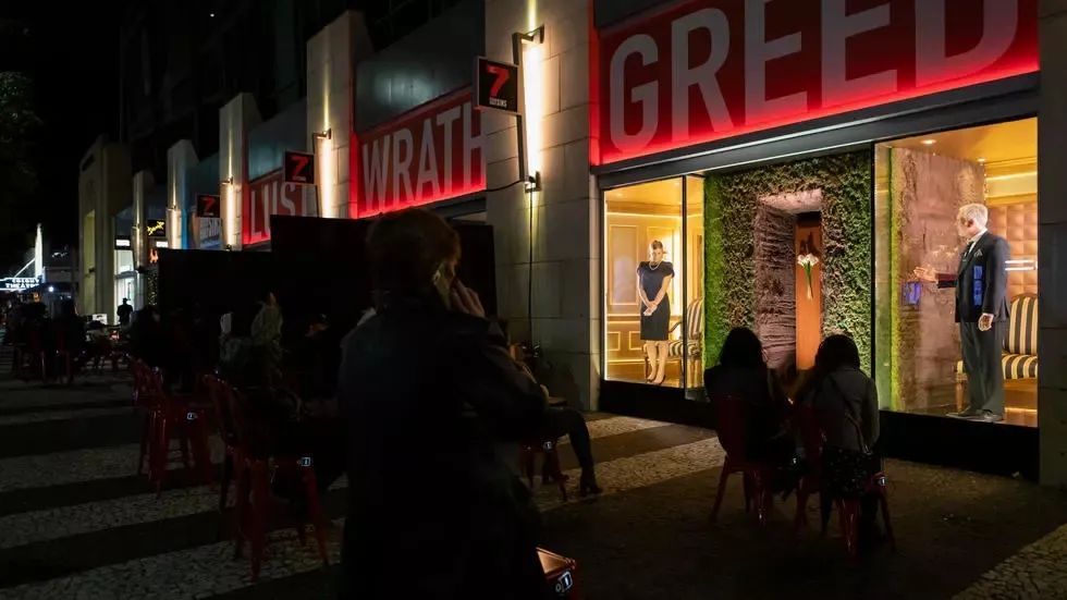 《七宗罪》在户外用商店的橱窗作为舞台,因疫情关闭的商店却成了表演的舞台,无论是剧本的主题还是执行都不同寻常。《七宗罪》分为7个10分钟的演出,观众坐在街上通过橱窗观看表演,用耳机收听。
