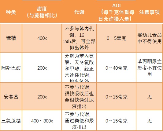 ▍人工合成甜味剂:阿斯巴甜、糖精、安赛蜜、纽甜、三氯蔗糖等。