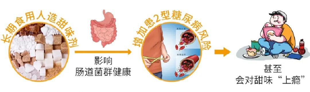 对于人造甜味剂,长期食用可能会影响我们的肠道菌群健康,增加患2型糖尿病的风险,甚至还会影响我们的饮食行为,让我们对甜味更加“上瘾”,想吃更多的甜味食物。