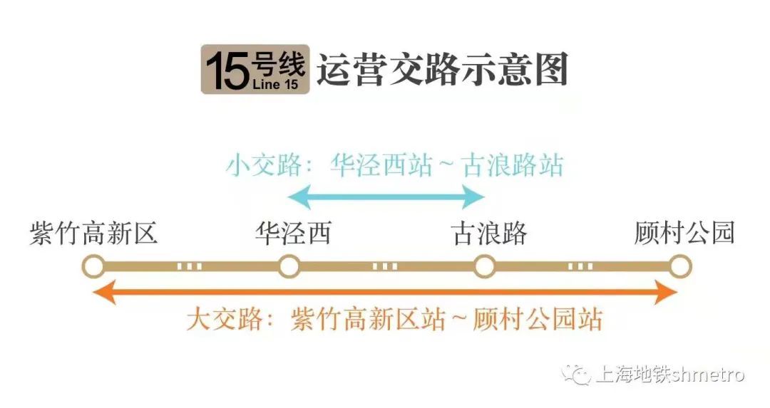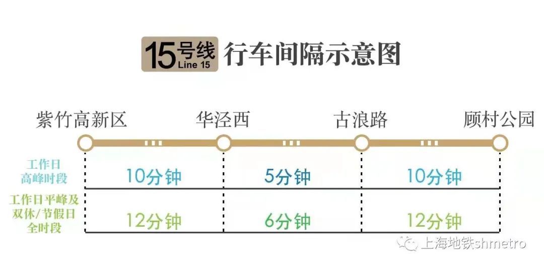 根据运行计划安排,15号线开通初期运营后,全天开行“紫竹高新区站至顾村公园站”的大交路,和“华泾西站至古浪路站”的小交路。运行间隔方面,15号线工作日早晚高峰最小行车间隔为5分钟;工作日平峰、双休日及节假日全时段,最小行车间隔为6分钟。