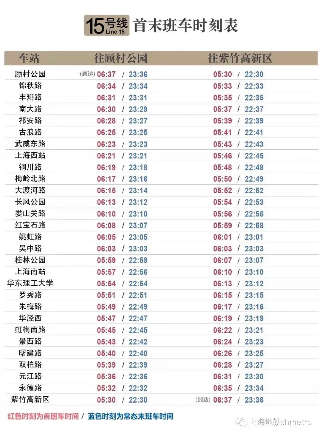 15号线开通初期运营后,全线常态运营时间为5:30至23:36。紫竹高新区站及顾村公园站首班车发车时间均为5:30,末班车发车时间均为22:30。