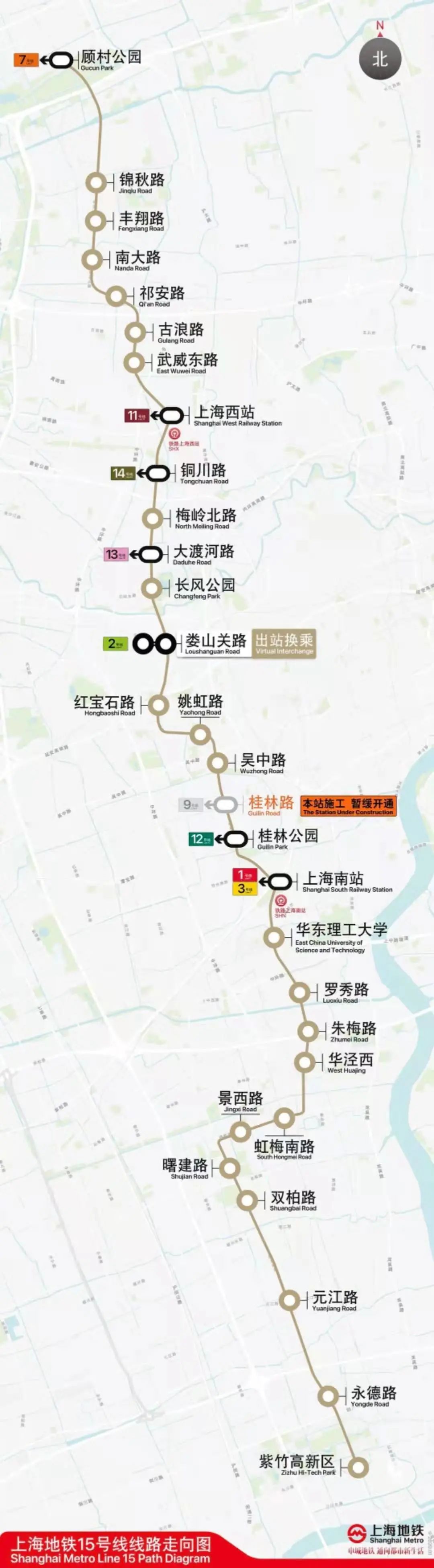 受疫情和施工建设难度等影响,此次15号线开通运营初期,桂林路站暂不开通,列车将“过站”运行,不停靠该站,不上下客,该站也不可实现9号线与15号线的换乘,请市民乘客提前做好路线规划。