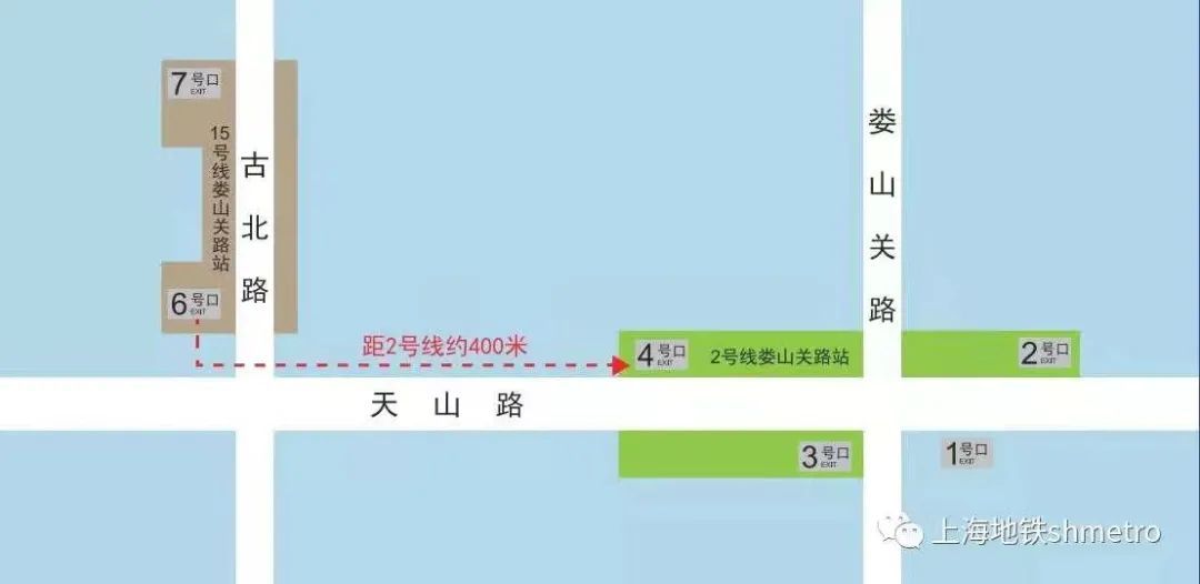 由于娄山关路站与2号线换乘通道涉及商业体地下空间改造,暂无法实现站内换乘。为解决换乘问题,在过渡期内,将15号线和2号线娄山关路站设置为虚拟换乘,其中15号线6号口至2号线4号口为最短换乘路径(详见下图)。根据测算,这两个出入口之间相距约570米,单程步行时间约为8分钟。在娄山关路站虚拟换乘的乘客,使用交通卡或“METRO大都会”APP进出站可享受连续计费。待改造完成后即可实现2号线与15号线的同站换乘功能。