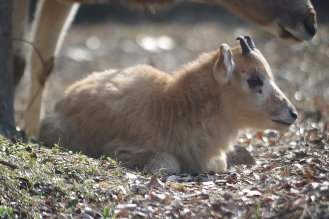 这只小崽全身毛茸茸的,看着十分可爱。不过旋角羚妈妈可绝不允许任何人靠近,就是同类也不允许,因此目前还无法得知小宝宝的性别。