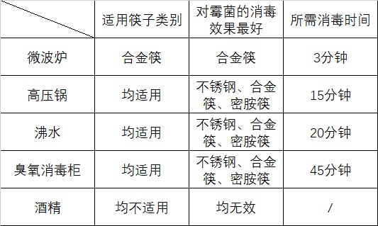 ●酒精对霉菌基本没有作用;微波炉虽然消毒时间最短(3分钟),但只能用于合金筷;五类筷子都可通过高压锅、沸水、臭氧消毒柜来消毒,只是所用消毒时间略有差异,“用沸水烫一下筷子”的做法基本没用,只有当消毒时间超过20分钟,筷子上的菌落和霉菌才能被有效去除。五类筷子中,不锈钢、合金、密胺筷更易消毒,木筷、竹筷稍差。