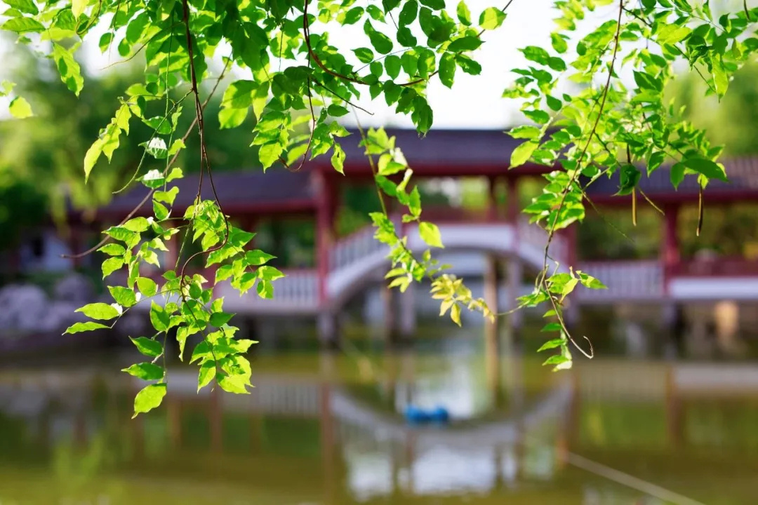 荟萃园是典型的江南园林风格,廊阁亭台、山石井泉具备,树茂花繁,盎然生机。坐在湖边,水天一色,都是翠绿。