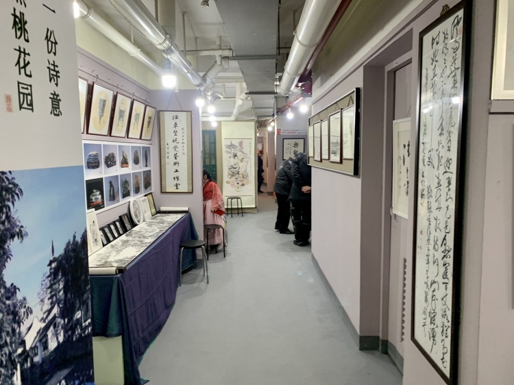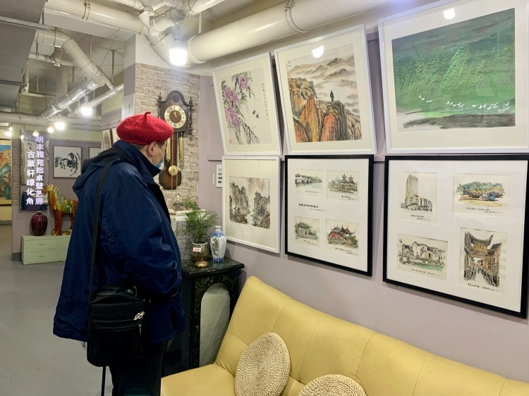 “哗啦啦……”在参观的过程中,偶尔也能听到下水道冲水的声音。“因为是地下室,相对湿度大,陈放展品的条件并不太好。”张树荪介绍,除了短期的特展展示书画实物之外,艺术长廊还保留一部分“常展”展品——把大家的画作印在kt板上,可以长久地陪伴来往居民。