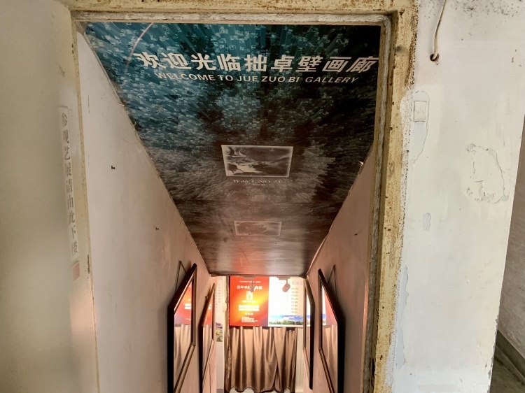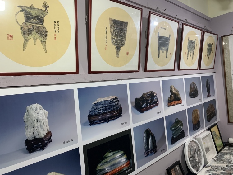 当天,这个名为“拙卓壁”的艺廊举办了一次为期半天的艺术展。别看只是一段通往地下室的狭窄走廊,这个“百年丰碑颂党恩”展览策划了八个展区:沿着地下长廊,参观者可以在“影音体验区”观看历史影像,欣赏国画、油画、素描,还能观赏奇石、拓片等珍藏,展品少说也有七八十件。伴随着小女孩演奏的钢琴曲声,参观者还能迈步进入更深处,欣赏更多特色主题展品以及了解艺术家的创作花絮。