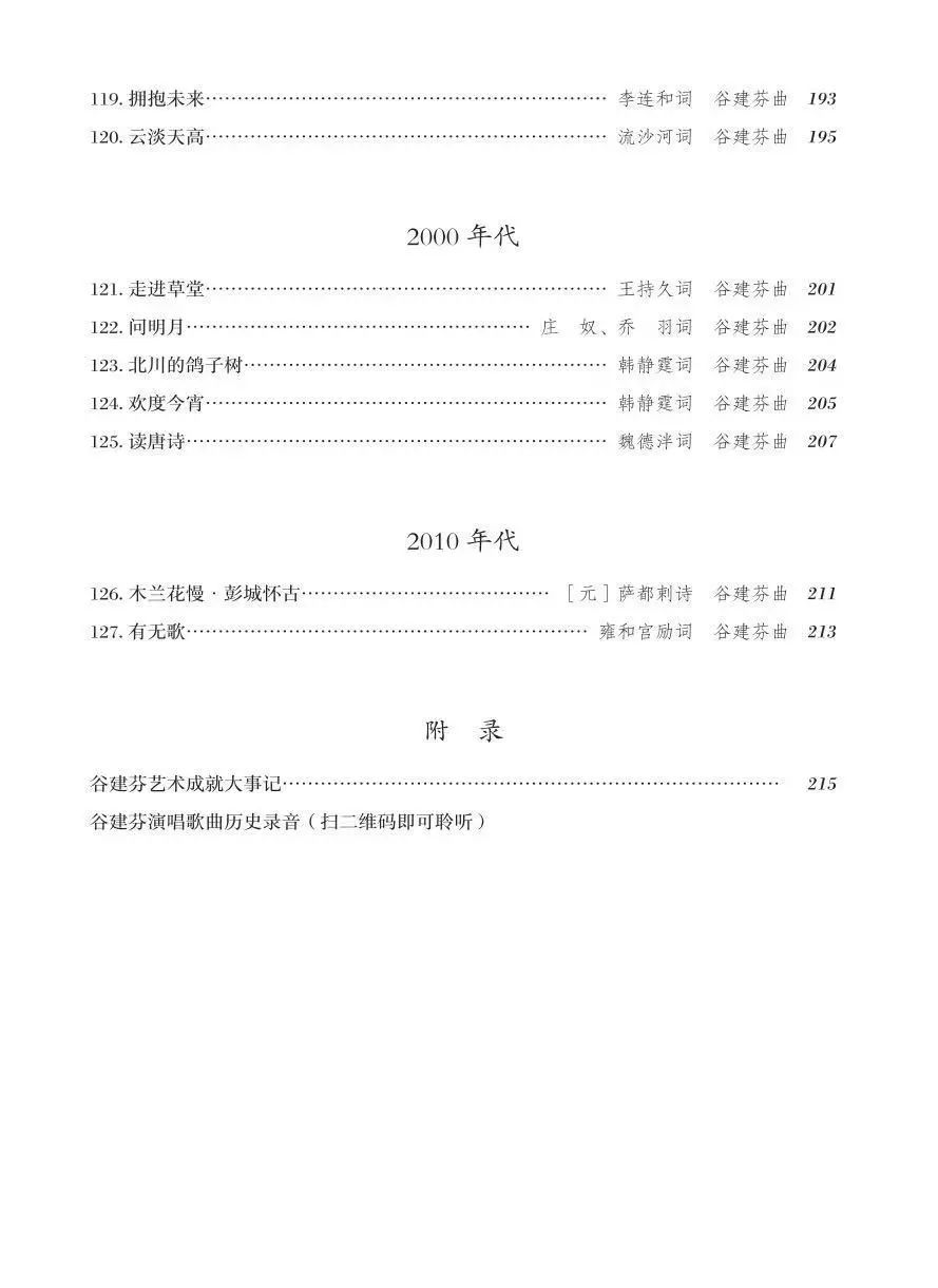 此外,本书还附有配套音响及扫码听,除书中所选的127首作品外,还可听到由谷建芬本人亲自演唱的13首作品。