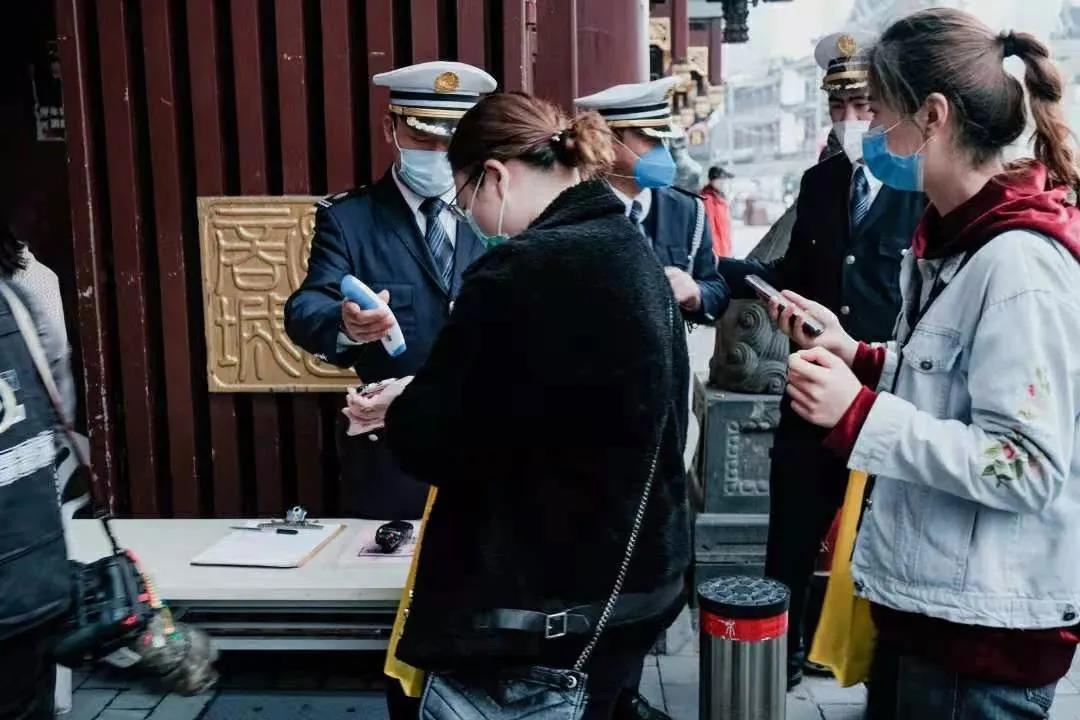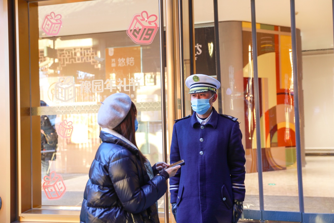 每天上午8:30至晚上21:00,商城的保安小哥哥们都会尽责地站在8个出入口,为每一位进入豫园商城的人员测量体温。保安小哥哥们会耐心地提醒大家要佩戴口罩,并出示随申码和行程码,认真确认每一位入园者的随申码与行程码显示是绿色。
