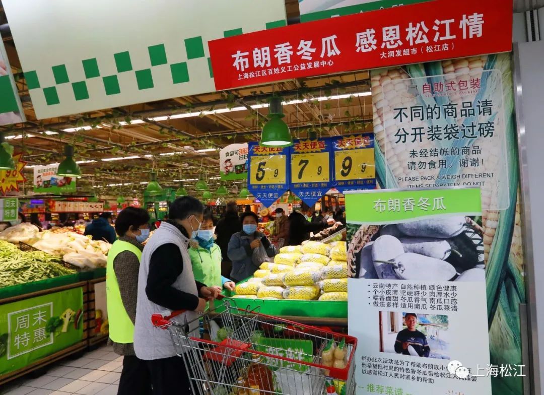 山海之间,遥远的距离阻隔不断两地情谊。大润发超市松江店相关负责人获悉情况后,也主动安排超市让出一个免费柜台,拉开了这场“布朗香冬瓜,感恩松江情”公益活动,让公益助农从“线上”落地到“线下”,让西双版纳特产走进更多的松江百姓人家。