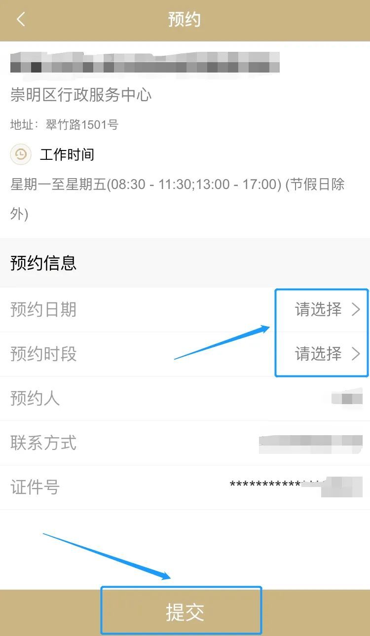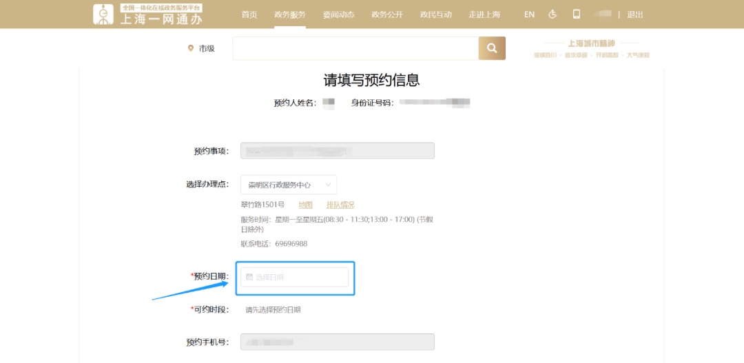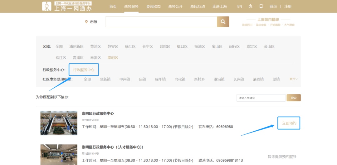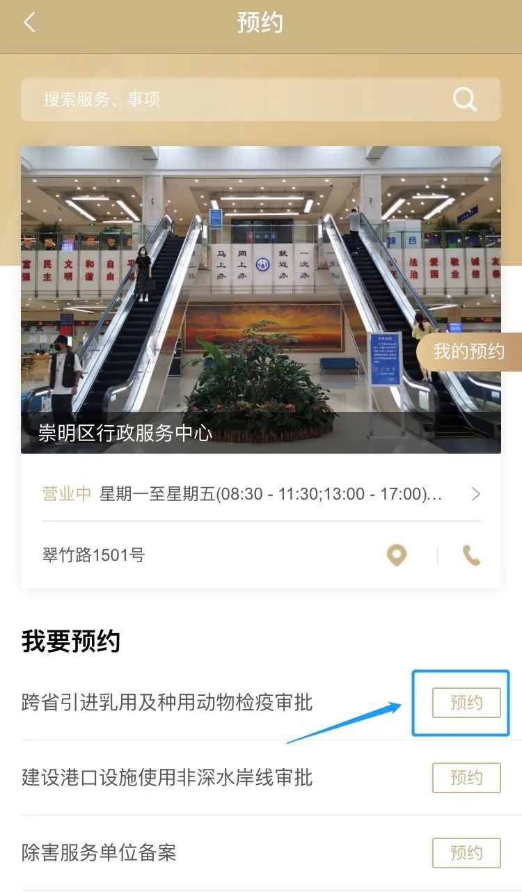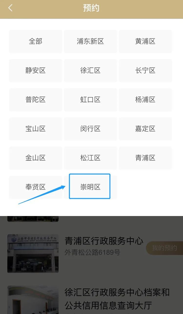 2、手机端:登录“随申办市民云”APP,点击【办事】→【预约】→【崇明区】→【办理点选择“崇明区行政服务中心”】→【选择需办理事项】并填写预约信息,在预约时间至中心服务大厅取号办理。