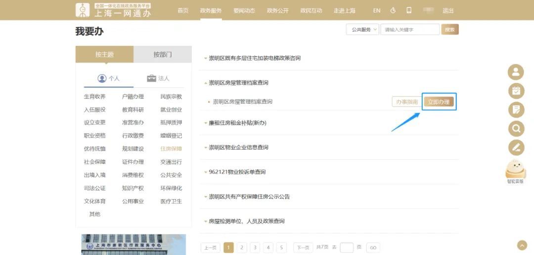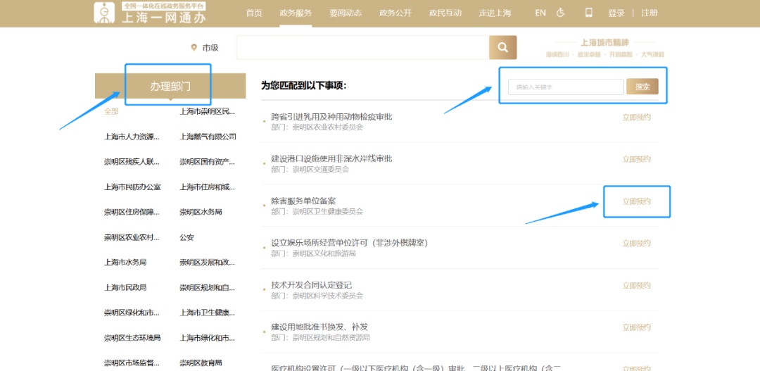 1、电脑端:登录上海市“一网通办”门户网站(http://zwdt.sh.gov.cn/)→【切换部门、区、管委会】→【区】→【崇明区】,选择【按主题】或【按部门】栏目进行网上事项办理,也可以直接【搜索】事项名称,点击【立即办理】进行网上申报。