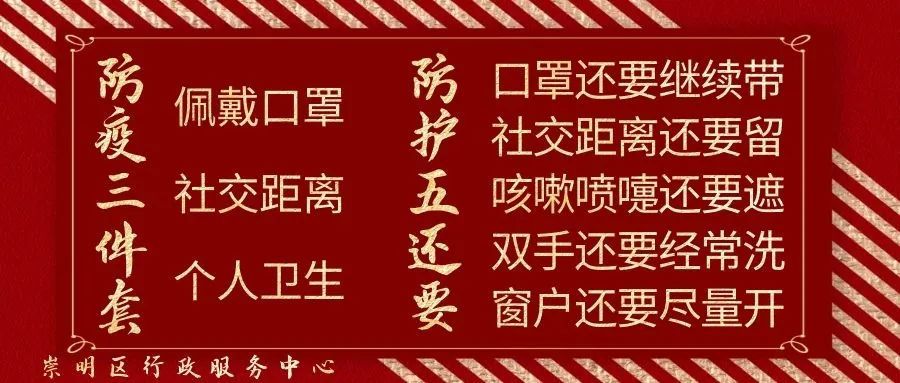 为全面贯彻落实好市、区新冠肺炎疫情防控工作会议最新要求,全力做好疫情防控,有效减少人员聚集,为广大市民朋友提供更加安全、高效、优质的政务服务,崇明区行政服务中心温馨提示如下: