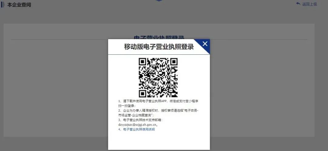 ▶在企业查阅时,点击移动版电子营业执照登录,会弹出二维码,并使用微信或支付宝的电子营业执照小程序扫码登录。
