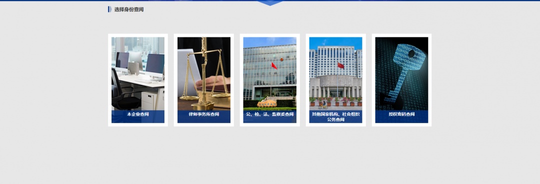 ▶电子档案查阅,可以以五类身份进行查阅,分别是本企业、律师事务所、公检法监察委、其他组织机构、特定机构。