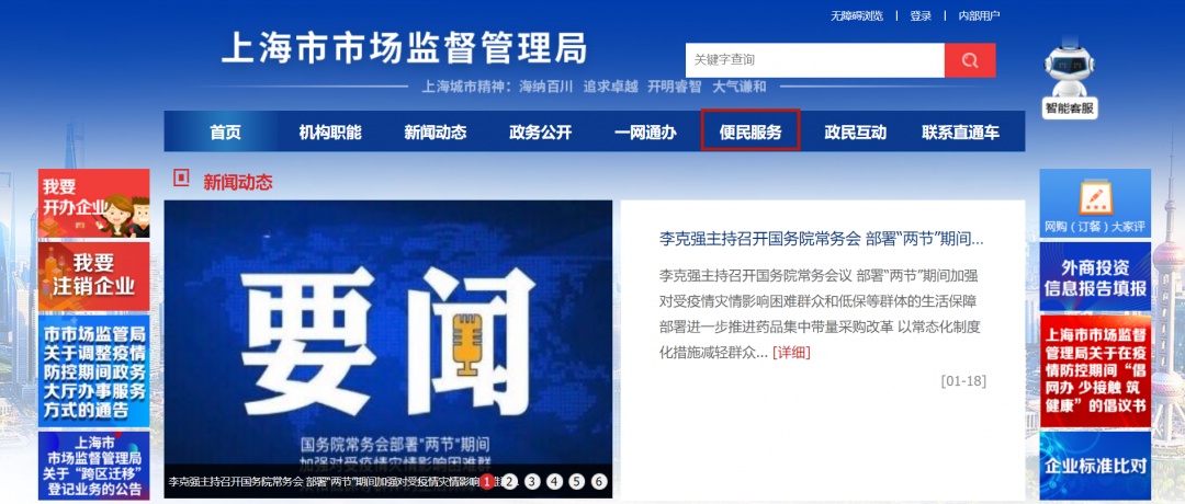 ▶登录上海市市场监督管理局官方网站(http://scjgj.sh.gov.cn/),选择导航栏中的便民服务