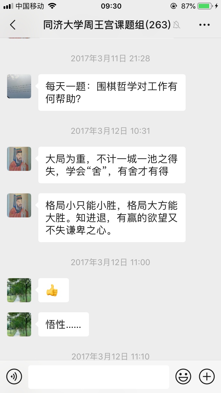 团队群里还有“每日一题”:“围棋哲学对工作有何帮助?”“为什么说上善若水?”“专注和乏味的区别在于什么?”“楷书的‘左’与‘右’字的上面部分为什么写法和笔顺都不一样?”“干砌的卵石拱桥,为什么能够千年不变?”答案也是百花齐放。像“为什么春天的雪不是瑞雪?”发热答案:“春天作物都出苗拔节啦,下雪会冻的是苗(一张一径两叶的绿芽图),不是害虫啊”“冬雪麦被,春雪麦害(配一只小黄鸭)”@了周顺华。“心静是什么”题下,答案更多了:没有绝对的静,否则,形如枯木,心如死灰,真正的心静是一种秩序;心静就是全身心专注一件事时的心境;花开花落,云卷云舒;无欲无求……