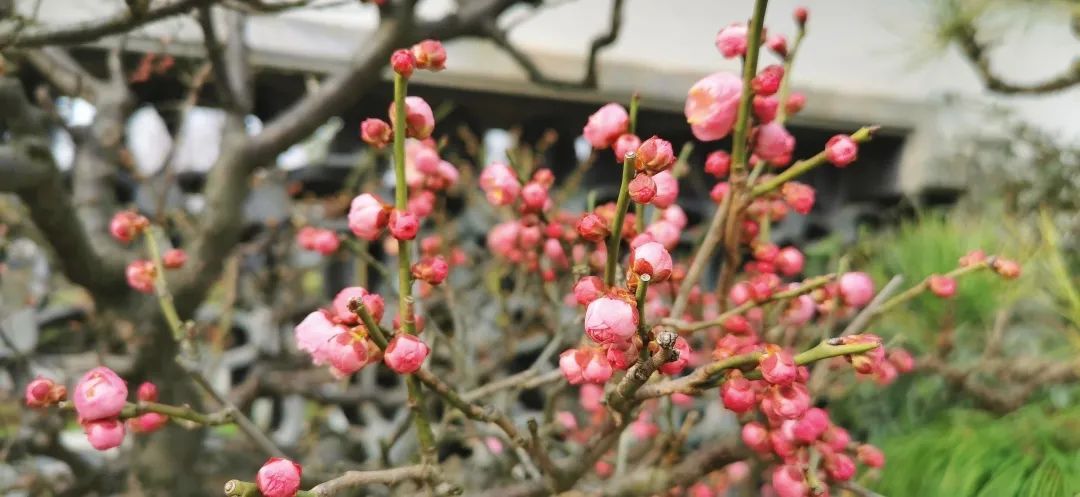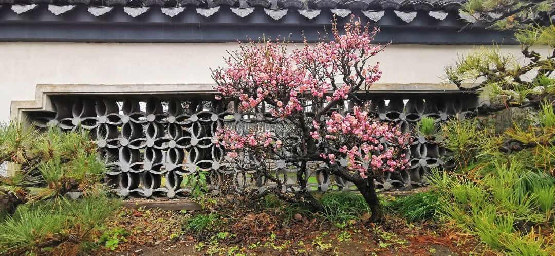 盆景园内的《岁寒三友》和《新岁寒三友》中的梅树盘根错节,坚韧遒劲。初花时节,玫红的花苞布满枝头,晶莹璀璨,好不美丽。三色梅上更有颜色迥异的花朵竞相绽放,相映成趣,为苍翠幽深的盆景园增添一抹亮色,带来春天的味道。