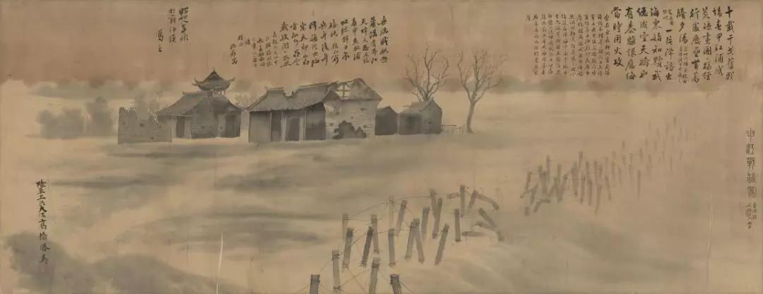 在上海淞沪抗战纪念馆里,珍藏着这样一幅画,看上去像一幅国画,却不是画在宣纸上,而是画在绢上。画的既不是山水,也不是人物,而是一座荒凉的村庄,断垣残壁,破败凋敝,秋风萧索,满目凄凉。