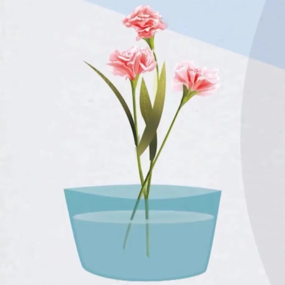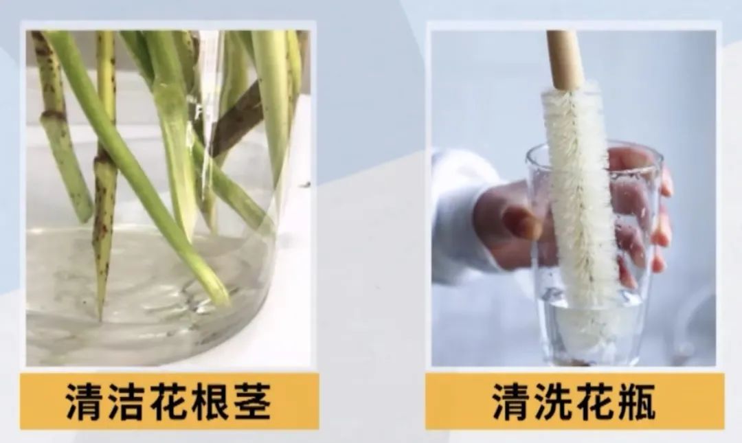 注意:在换水的过程中,需要剪一道新的缺口,让花朵吸收新的水分。这是由于旧的斜口因为时间较长可能会导致堵塞。