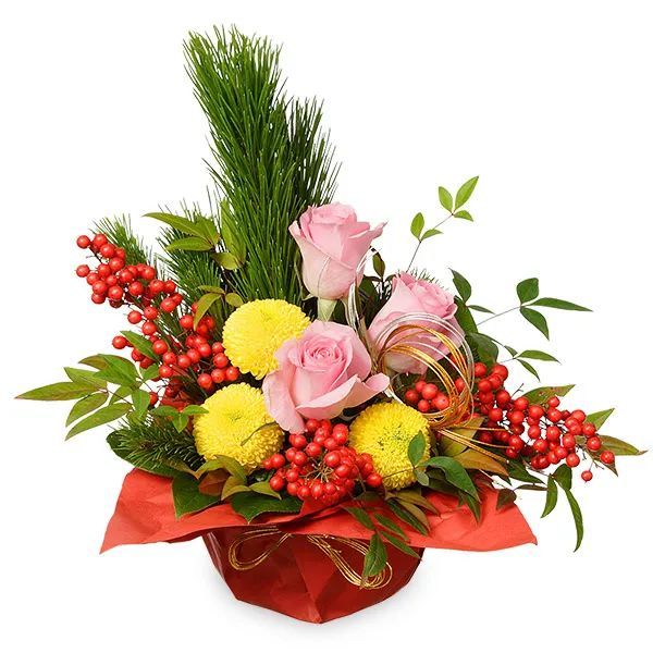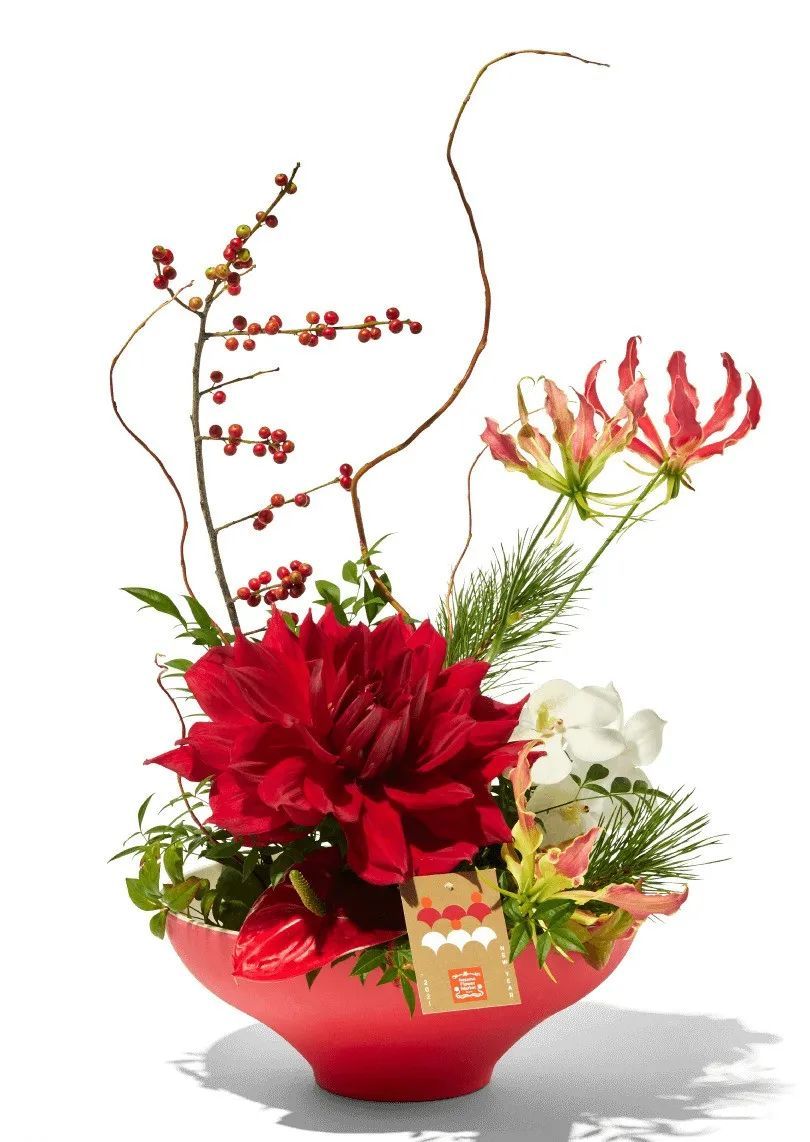 使用招财猫环抱南天竹叶,谐音新春“爆竹”。扶郎、多头康乃馨、玫瑰与折扇,象征烟花绽放的团团喜庆气息,银柳节节向上是对新年进步的期许。