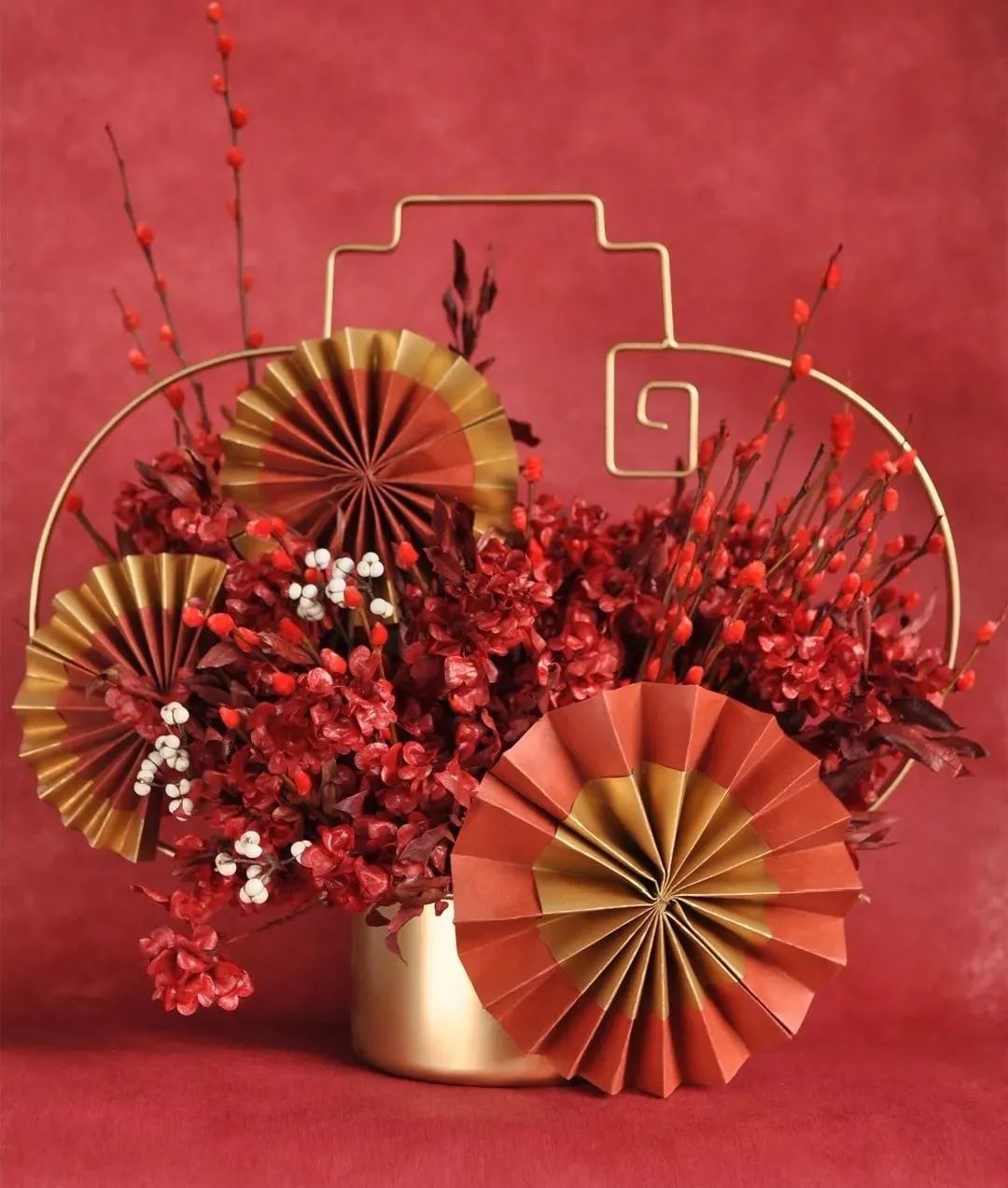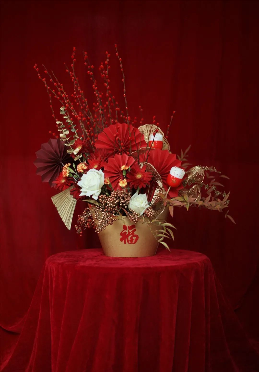 用春节的醒狮饰品装饰花间。冬青象征收获的饱满与丰硕,银柳节节攀升,金色的鸭掌木叶子象征八方来财,郁金香优雅灵动与中式传统木制手提盒相呼应,喜庆中又带着传统节日的端庄与大气。