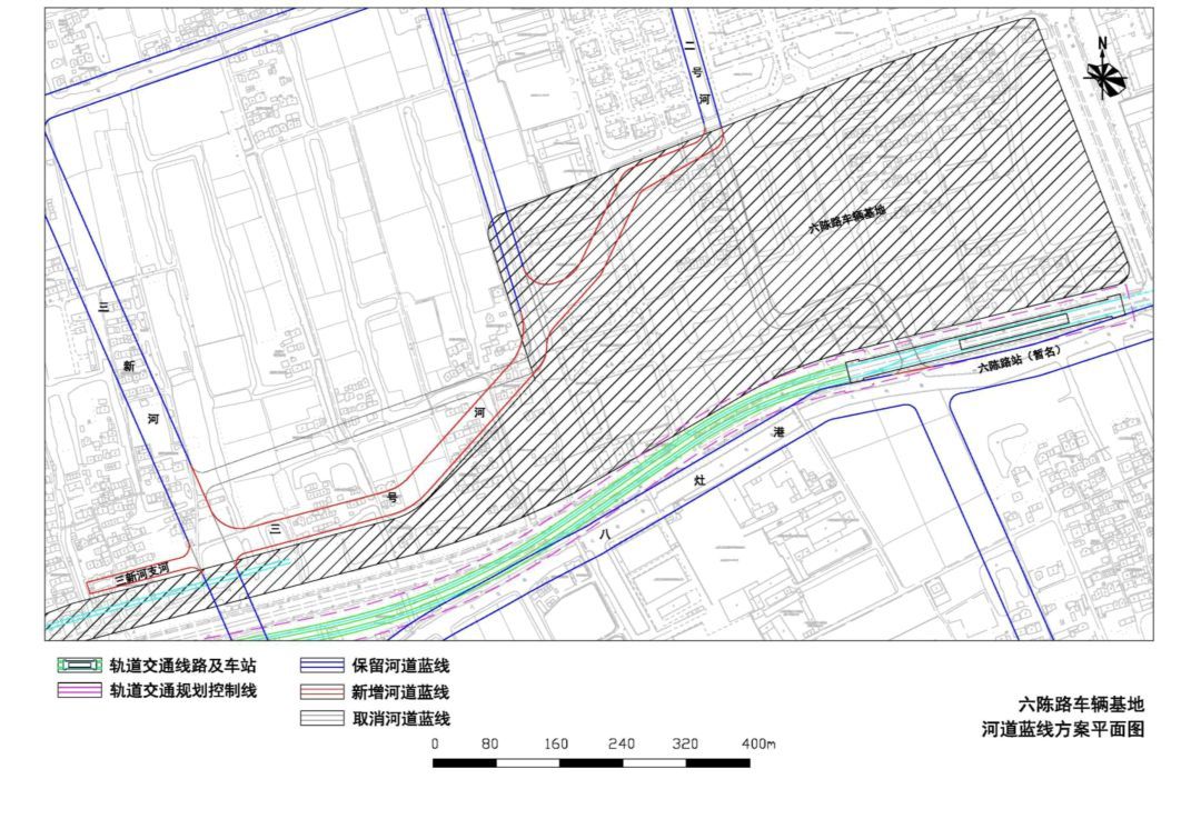 车辆基地:线路设置六陈路车辆基地,在满足轨道交通停车列检等功能基础上,预留上盖综合开发利用。车辆基地位于六陈路以北、川沙路以西、川图路以南。对车辆基地涉及的河道蓝线等规划控制要素同步调整。车辆基地上盖综合开发利用功能将与地区规划相协调,并结合后续的方案深化进一步明确。