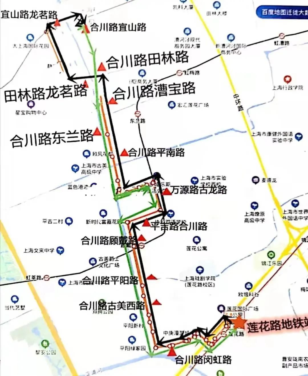 莲花路地铁站,合川路闵虹路(上行)闵虹路合川路(下行),合川路古美西路,合川路平阳路,合川路顾戴路(上行单向),平吉路合川路(上行)合川路平吉路(下行),万源路古龙路,合川路平南路,合川路漕宝路(上行),田林路龙茗路(上行)合川路东兰路(下行单向),宜山路龙茗路(上行)合川路田林路(下行),合川路宜山路